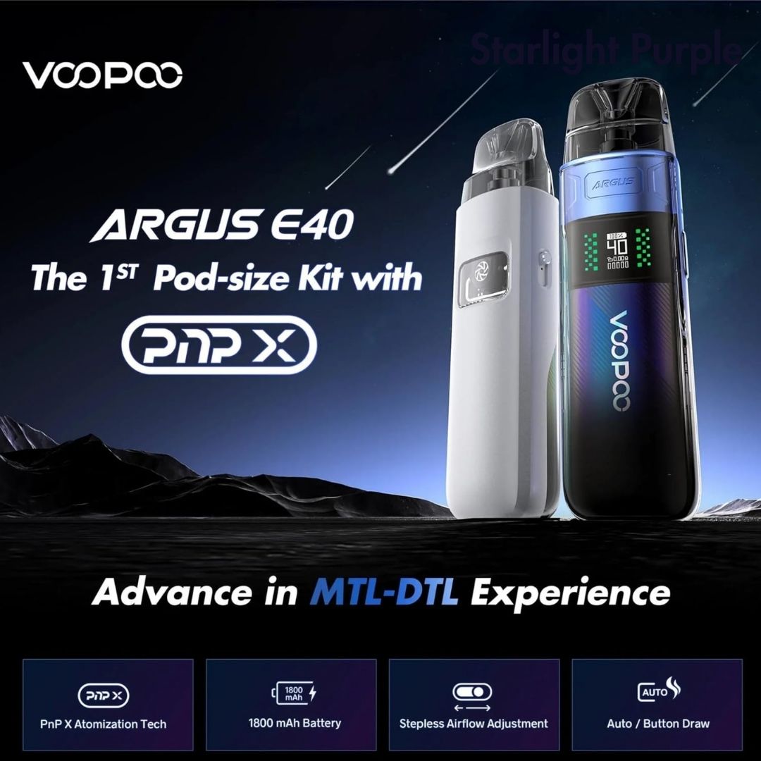Voopoo Argus E40 pod kit is designed with 1800mAh battery, auto/button draw. Adopting PnP X Atomizer Tech, it is compatible with PnP X Coils, provides denser cloud & purer taste, 100 ml long coil life without leakage & coil burning. With the stepless airflow adjustment, you can adjust vaping from MTL to DTL smoothly. VOOPOO Argus E40 is also compatible with Argus PnP X Cartridge with PnP X 0.3Ω/0.45Ω/0.6Ω.